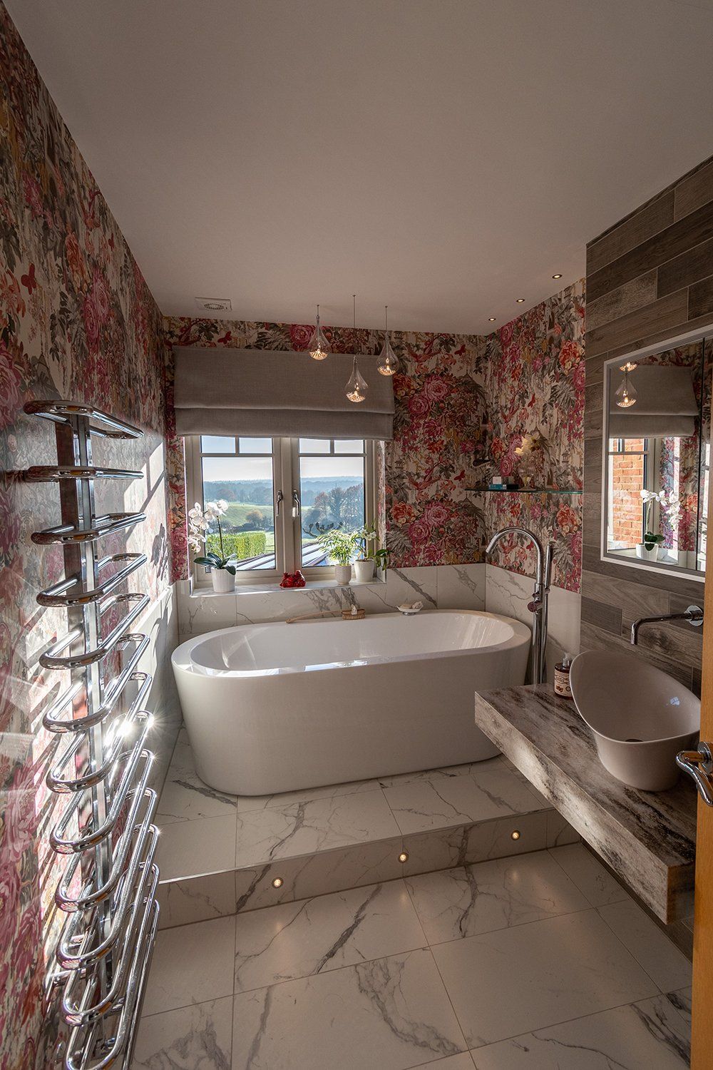 This room is like a scene from a film set…. The deep freestanding bath is the feature of the room, which is filled elegantly with a Crosswater floor standing bath shower mixer. All of this is set on a lit plinth perfect to lie in with a glass of wine and look out at the beautiful view out of the window. Above the bath are 3 ceiling lights which provide subtle and simply pretty light into the room.